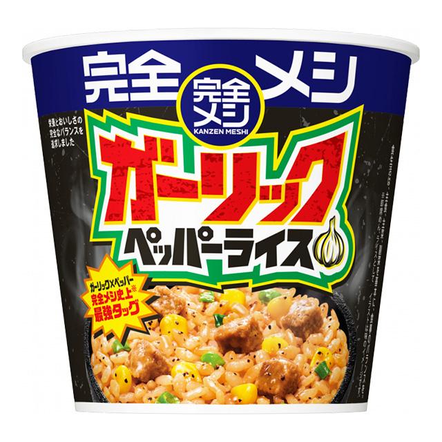 この商品は、見た目や美味しさはそのままに…日本人の食事摂取基準に基づいた33種類もの栄養素が摂取できる“栄養と美味しさの完全バランス”をコンセプトにした“完全メシ”の新フレーバーで、人気の“ガーリックペッパーライス”を再現、牛をベースにローストガーリックとブラックペッパーでアクセントを利かせたパンチのある一杯、“完全メシ ガーリックペッパーライス”となっております。(値段:税別398円)