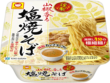 今回ご紹介するカップ麺は、美味しさにこだわったマルちゃんの“謹製(きんせい)”シリーズの新商品ということで、コクのあるチキンの旨味を利かせたあっさりとした塩ソースに仕上がり、食べ進めて行くに連れて少しずつほんのりとした痺れが楽しめる「和」山椒の風味がアクセントとなった一杯、“謹製 山椒香る塩焼そば”となっています。