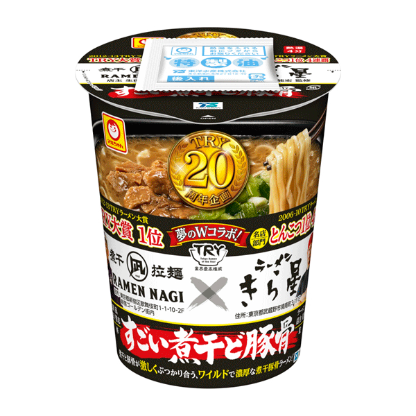この商品は、“TRYラーメン大賞20周年”を記念して発売されたもので、“TRYラーメン大賞2012-2013”の“TRY大賞”1位獲得の「ラーメン凪(なぎ)」と、同じく“TRYラーメン大賞2006-2010”の“名店部門とんこつ”で1位を4連覇達成した“きら星“との夢のWコラボ商品としてカップ麺でしか食べることのできないオリジナルメニューの一杯が登場です!