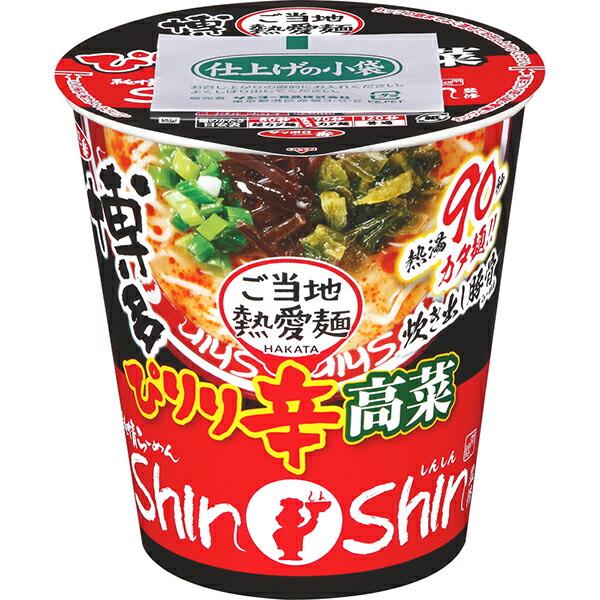 この商品は、福岡市中央区天神に本店を置く人気ラーメン店“博多純情らーめんShinShin(シンシン)”監修によって人気メニュー“高菜らーめん”を辛口にアレンジしたもので、数種のポークエキスやポーク調味料をベースに唐辛子とラー油を加えた旨辛な一杯、“博多純情らーめんShinShin監修 辛高菜豚骨らーめん”となっております!(値段:税別271円)