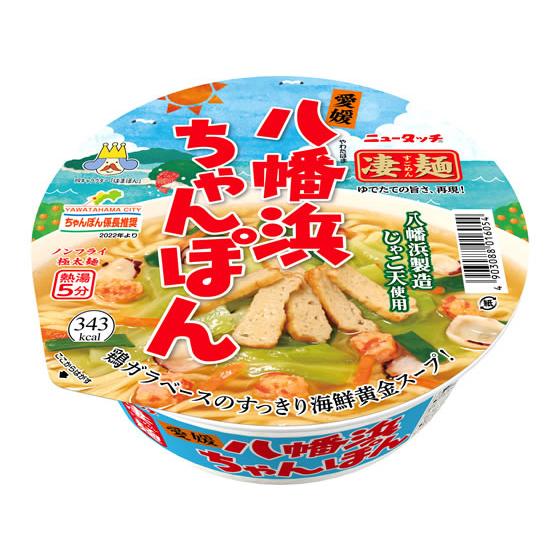 この商品は、茹でたてのような旨さ、お店のような美味しさでお馴染み“凄麺(すごめん)”シリーズから発売されているもので、愛媛県八幡浜市(やわたはまし)で古くから親しまれている“八幡浜ちゃんぽん”の味わいをカップ麺に再現、鶏ガラ・鰹・昆布などで出汁を取った黄金色のスープに仕上げ、シリーズらしい本格感のあるノンフライ仕様の太麺が絶妙に絡む一杯、“凄麺 愛媛八幡浜ちゃんぽん”となっております。(値段:税別255円)