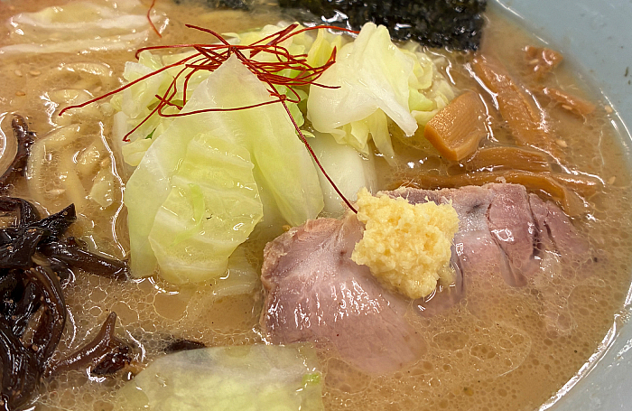 特徴としては…“山岡家”らしい豚骨の旨味にまろやかな白味噌を合わせたことで濃厚感が際立ち、キクラゲ佃煮や“おろし生姜”でアクセントを付け、他にもチャーシューやキャベツなどを使用した贅沢な一杯です!